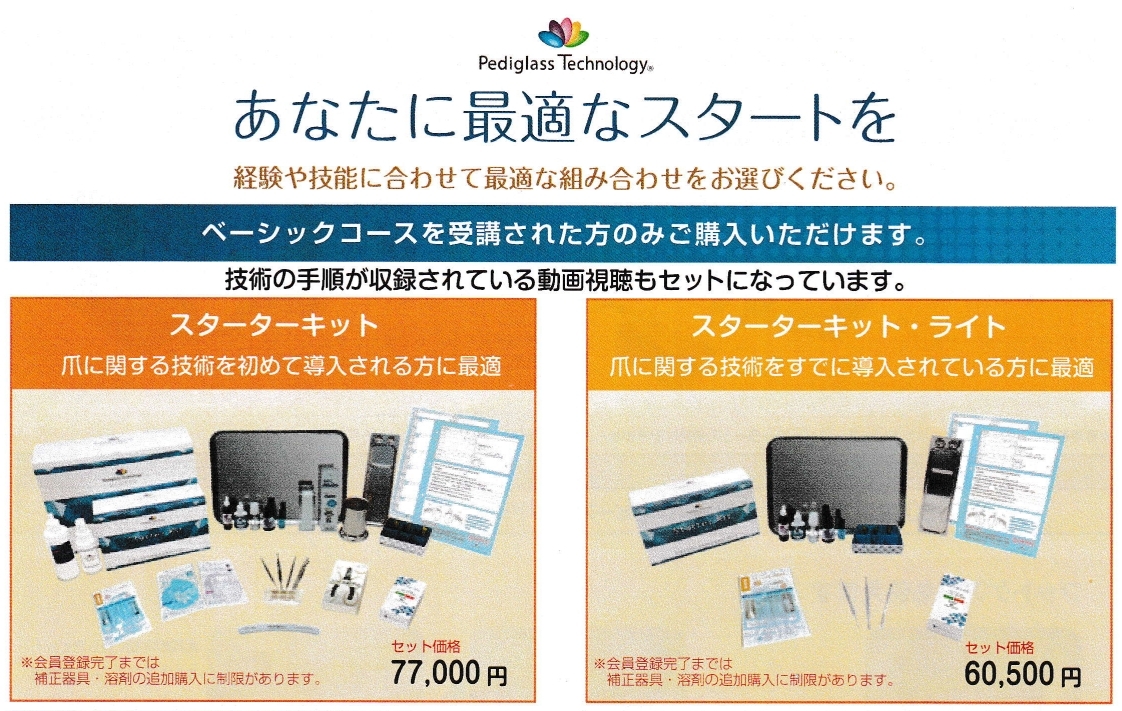 〇巻き爪技術導入のための機材に関しては、受講前(スターターキット)もしくは受講後に購入が必要になります。(セミナーに必要な諸用品は、こちらから貸し出します)